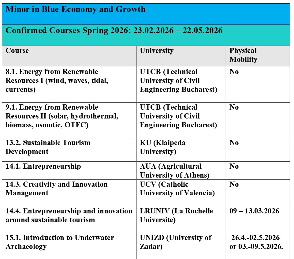În Blue Economy and Growth Minor, UTCB oferă următoarele cursuri doar pentru semestrul din primăvară: